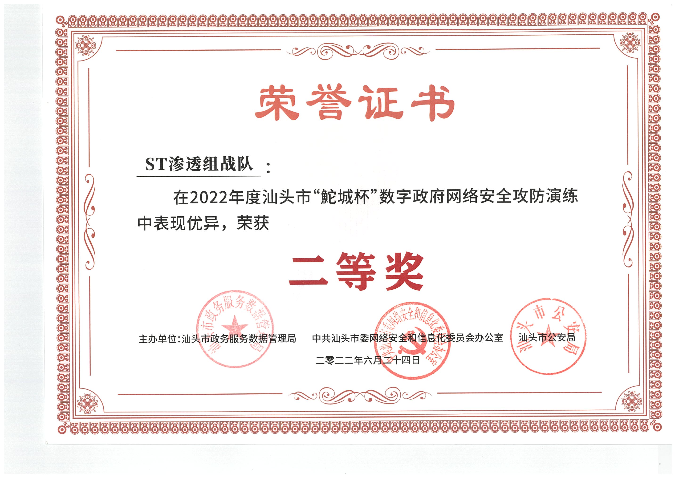 • “鮀城杯”數(shù)字政府網(wǎng)絡安全攻防演練二等獎