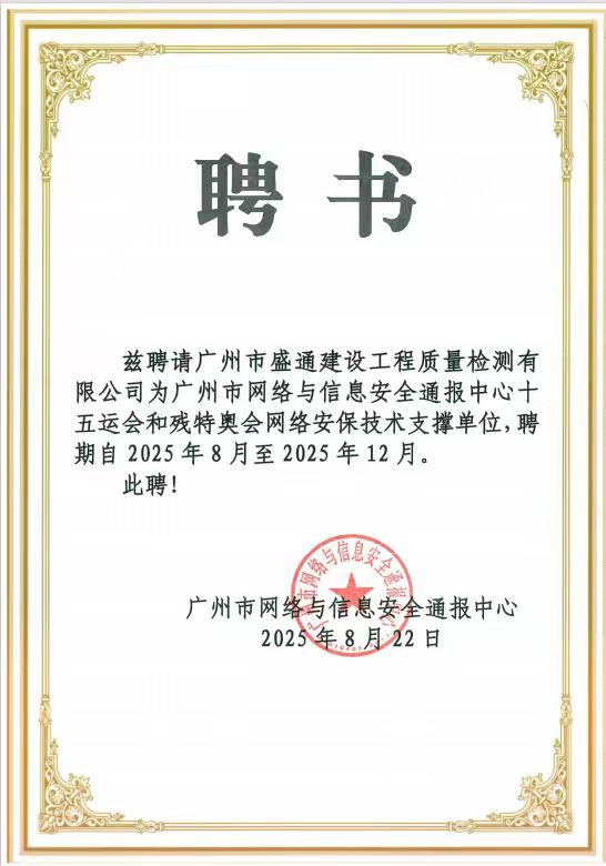 盛通檢測在全運會網(wǎng)絡(luò)安全保障中的卓越表現(xiàn),源于一份沉甸甸的官方信賴。早在賽事籌備階段,廣州市網(wǎng)絡(luò)與信息安全通報中心便正式聘請我司為“十五運會和殘?zhí)貖W會網(wǎng)絡(luò)安保技術(shù)支撐單位”,這既是對公司技術(shù)能力的高度認(rèn)可,也賦予了公司在關(guān)鍵時期守護網(wǎng)絡(luò)安全的核心職責(zé)。